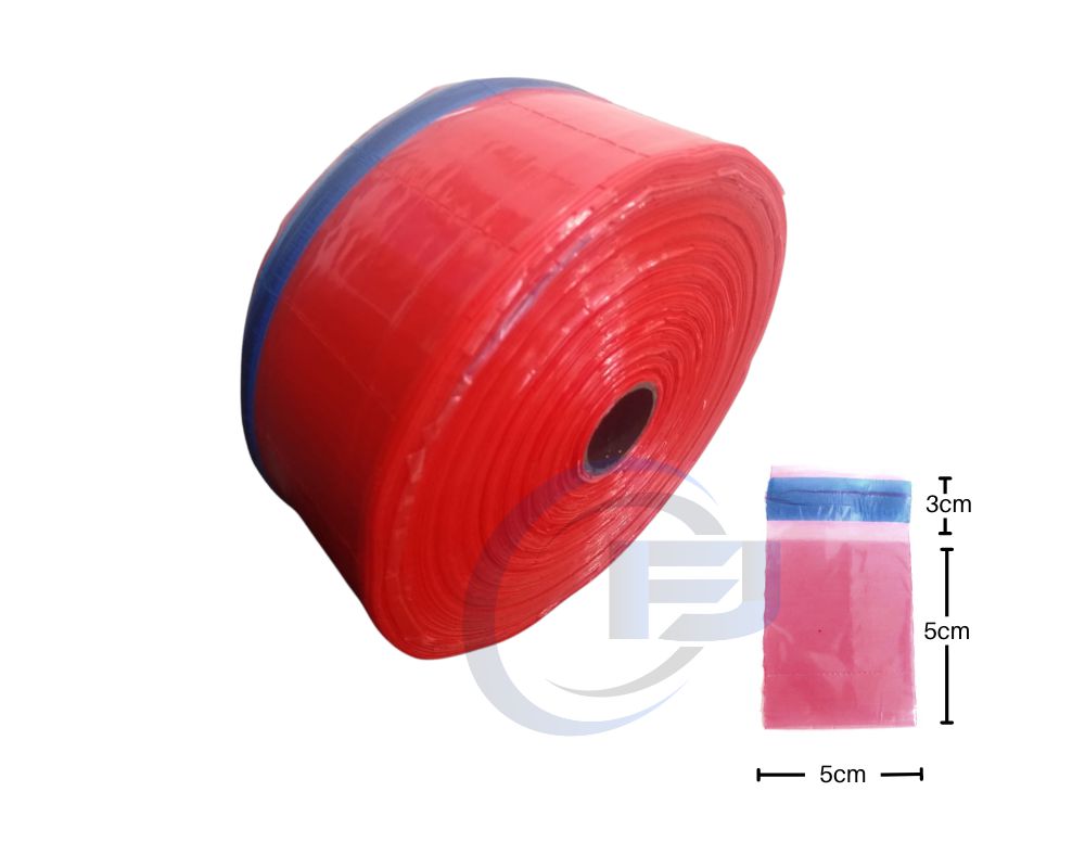 Embalagem plástica 5x5 p/ unitarização de medicamentos, plastico VERMELHA, bobina com 10.000 sacos.